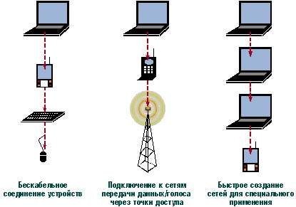 Bluetooth позволит без лишних трудностей отправить с лаптопа страницу на печать или подключиться к мобильному телефону для выхода в Internet по беспроводному соединению. При этом сам телефон может находиться у пользователя в кармане, а переговоры можно будет вести с помощью беспроводной головной гарнитуры — подобное устройство недавно продемонстрировала Ericsson Datacom.