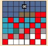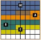 1. Эта сетка представляет память компьютера. Голубыми квадратиками изображена память, используемая операционной системой, а коричневыми — память, занятая под системные утилиты и программы. Теперь мы запускаем три приложения — A, B и C (оранжевый, зеленый и желтый соответственно). Каждое из приложений запрашивает и получает фрагмент памяти от операционной системы. До этого момента все просто и ясно.