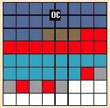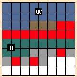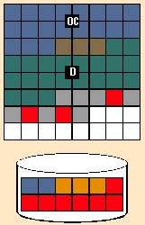 3. Завершается приложение B и возвращает обратно всю свою память. Но запускается приложение D, которому требуется цепочка из 20 подряд идущих блоков. Но цепочек такой длины нет. Самый большой фрагмент, включающий в себя всю память, которую использовала Программа B и первая часть C (окрашенный в бирюзовый цвет) состоит из 14 блоков. Операционная система не в состоянии предоставить Программе D всю необходимую память.