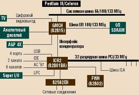 Если «раздеть» компьютер до материнской платы, то на ней между многочисленными разъемами можно разглядеть ее «плоть от плоти» — микросхемы, входящие в состав i815/815E (их бывшие кодовые названия — Solano/ Solano2). Их совсем немного (см. рисунок): это северный мост GMCH (Graphics and Memory Controller Hub), южный мост ICH (I/O Controller Hub) и FWH (Firmware Hub). Концентратор контроллеров ввода/вывода ICH в наборе микросхем i815E модернизирован и называется ICH2 (об отличиях скажем чуть ниже).