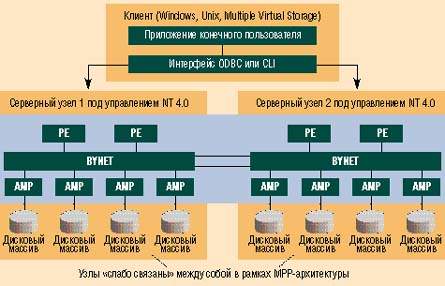 Teradata устанавливается на вычислительную систему MPP-архитектуры, каждый узел которой работает под управлением Windows NT и может содержать до четырех процессоров. Процессоры модуля доступа (APM) отвечают за доступ к базе данных, а механизмы синтаксического разбора (PE) обрабатывают поступающие от клиента SQL-запросы, управляют сеансами с AMP и возвращают результаты запросов клиенту