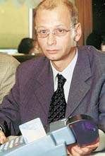 | Vip-директор отделения VeriFone EMEA Стефано Салтери демонстрирует POS-терминал Omni-3350 |