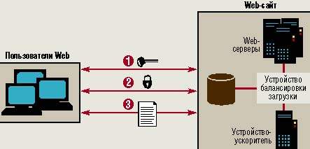 1. Первичная аутентификация и процесс генерации ключей инициируют «переговоры» между пользователем и защищенным Web-сайтом. Устройство балансировки нагрузки перенаправляет запросы устройству-ускорителю