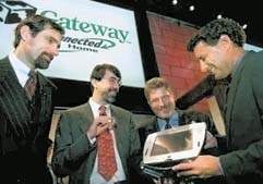 | Генри Николас, президент Broadcom, Дэвид Дитцел, генеральный директор Transmeta, Барри Шулер, президент AOL Interactive Services, и Джефф Вейцен, президент Gateway, с Web-приставкой на базе процессора Crusoe, разработанной компаниями AOL и Gateway |