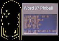 Разработчики Microsoft Word 97, не желая уступать коллегам, придумали свою забаву — пинбол. Инструкция по проникновению: открыть новый документ, напечатать «Blue» и выделить слово. Затем в меню Format/Font выбрать Font Style Bold, Colour Blue. Затем вернуться в документ, напечатать пробел после слова и нажать на Help/About. Находясь на пиктограмме Word, нажать Control-Shift-left, после чего появляется игра. Z управляет левым флажком, M — правым, для выхода надо нажимать Escape.