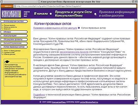 На сегодня его банк данных включает более 4 тыс. графических копий нормативно-правовых актов высших органов государственной власти, принятых после 1 января 2000 года. В графическом формате эти документы занимают объем более 1 Гбайт. В архиве можно найти федеральные законы, указы и распоряжения президента, постановления и распоряжения правительства РФ, акты обеих палат Федерального собрания и постановления Конституционного суда. В качестве базовых выбраны графические форматы TIF и PNG. Это связано с тем, что копии документов, представленных в этих форматах, обеспечивают наиболее полную идентичность по отношению к исходным документам, позволяют избежать искажений и ошибок, иными словами — дают возможность не только прочесть документ, но и воочию увидеть его, убедиться в надежности и достоверности информации.