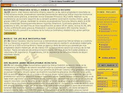 Когда руководство страны отказалось признать победу кандидата от оппозиции Воислава Коштуницы, народ вышел на улицы, а кое-кто — в Сеть. Самое горячее время пришлось на первые числа октября. Как утверждают в Free B92, за день их сайт посещало до 100 тыс. человек — рекорд для всех республик бывшей Югославии.