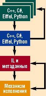 Исходный файл. Различные языки программирования поддерживают разные типы. Компиляторы .NET. Типы в нескольких различных языках программирования наследуют новый тип из библиотек .NET Framework. Исполняемый файл. Итоговый промежуточный язык (IL) сохраняется в файле, с новыми типами метаданных; другие языки могут теперь импортировать этот файл. Время исполнения. Исполняющая система компилирует, загружает и начинает исполнение файла IL; ссылки на типы, определенные в другом файле IL, вызывают загрузку этого файла, используя новый тип во время исполнения после того, как прочитаны его метаданные. |
