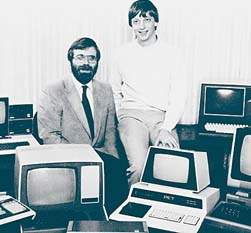 | Основатели Microsoft Пол Аллен и Билл Гейтс в окружении персональных компьютеров вскоре после подписания крупного контракта с IBM на создание программного обеспечения для своей серии ПК. Эта фотография была опубликована 19 октября 1981 года в журнале Seattle Business Journal вмесе со статьей "Путь к успеху, владельцы Microsoft поразили цель в 100 млн. долл." |