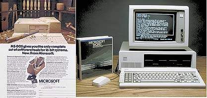 | Один из первых компьютеров IBM PC, с установленным на нем пакетом Microsoft Word. Слева одна из первых журнальных реклам операционной системы MS-DOS 1.0 |