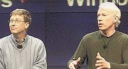 | Билл Гейтс и Джим Олчин, представляя операционную систему Windows XP, основной упор делали на мультимедийные функции этой разработки |