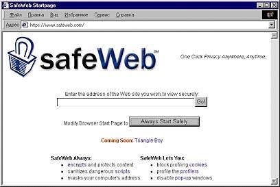 Сейчас любой желающий, посетив сайт SafeWeb, может воспользоваться программой, позволяющей обращаться к необходимым информационным ресурсам Сети без опасности быть узнанным. Программа подменяет поле ввода URL в браузере на собственное и устанавливает с ресурсом зашифрованное SSL-соединение, автоматически отключая файлы cookie.
