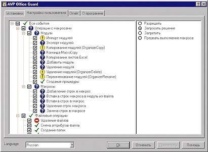 | Интерфейс OfficeGuard достаточно прост: в окошке перечислен список действий, которые потенциально опасны. Пользователь может указать, является ли данное действие разрешенным, требует подтверждения или является запрещенным |