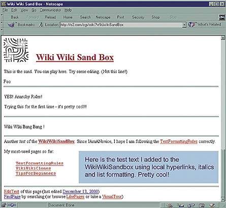 | WikiWiki Sand Box дает возможность создать среду для совместной работы, где пользователи могут менять или добавлять информацию на сайт посредством обычного браузера |