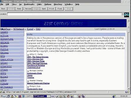 Есть чем поживиться в Internet и желающим пополнить свои знания в современном английском языке, вернее, главным образом в его американском диалекте. Но для поиска интересующих книг придется приложить некоторые усилия: сетевые библиотеки, содержащие современную литературу (как правило, защищенную авторским правом и потому распространяемую нелегально), разрозненны и часто совершенно бессистемны. Типичная западная Internet-библиотека — это Web-сайт на одном из бесплатных хостингов (такие сайты появляются едва ли не ежемесячно и столь же быстро исчезают — владельцы уничтожают их при первых же протестах со стороны бдительных пользователей), ftp-архив с парольным доступом или специальный сценарий на IRC-канале, который при помощи ftp-подобных команд позволяет выбрать и загрузить нужную книгу. Кроме того, интересующие книги, если они существуют в электронном виде, по запросу можно получить в появившейся около года тому назад специализированной конференции Usenet. О существовании тех или иных книг в электронной форме можно узнать из распространяемого по Сети списка (точных указателей на ресурсы Internet он не содержит).
