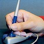 | Рычаг управления Ullman Mouse, закрепленный над мышью, больше похож на пишущую ручку, с помощью которой мышь перемещают по поверхности стола |