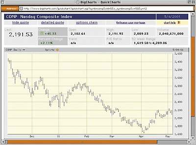 Во-первых, действительно ли имеет место оживление на бирже? По мнению некоторых аналитиков, все это напоминает ситуацию, наблюдавшуюся в самом начале года. Тогда индекс стал расти с 3 января, после того как Федеральный резерв сообщил о первом в этом году сокращении ставки рефинансирования. В тот день индекс Nasdaq вырос на 24 пункта, или 14,2%, и составил 2616,69.