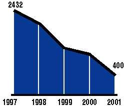 В свое время Fast Ethernet и коммутация на третьем уровне довольно быстро перешли из разряда супермодных технологий локальных сетей в категорию обыденных решений; та же судьба уготована и Gigabit Ethernet. На диаграмме приведена средняя цена коммутатора Gigabit Ethernet, в пересчете на порт (долл.) |