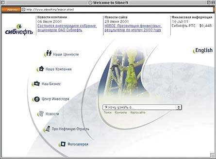 Компания «Сибнефть» обзавелась новой версией сайта. По адресу www.sibneft.ru теперь размещается около 500 Web-страниц, содержащих сведения о компании, о ее бизнесе, информацию для инвесторов, новости, а также популярное изложение основ нефтедобычи и нефтепереработки, глоссарий, краткий курс истории разработки нефтяных месторождений в России и фотографии по соответствующей тематике.
