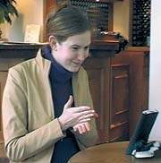 «Допустим, рядом со мной в приемной перед кабинетом доктора или в банке сидит человек с нормальным слухом, который не понимает языка знаков, — привела пример Бауэр. — Чтобы поговорить с ним, я звоню в указанную службу, и мои фразы, составленные из знаков, интерпретируются в обычную речь. Таким образом, невидимый переводчик всегда находится рядом со мной».