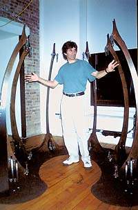 | В музыкальной установке Дэвида Шварца «музыкант» пританцовывает в окружении этаких однострунных арф, вместо струн у них — невидимые лучи, при пересечении которых генерируется звук разного тона и тембра |