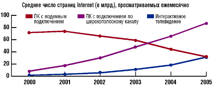 По данным Forrester Research, к 2004 году широкополосные службы доступа будут доминировать при просмотре Web-страниц. Кривая числа страниц, просматриваемых через узкополосные каналы персональных компьютеров, достигнет пика в этом году, после чего начнется постепенное снижение. В это время большие прибыли будет приносить интерактивное телевидение
