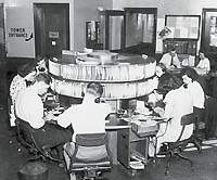 | До внедрения в середине 50-х годов системы Sabre сотрудники авиакомпаний регистрировали заказы на специальных цветных карточках, которые упорядочивались и размещались в специальной вращающейся картотеке |