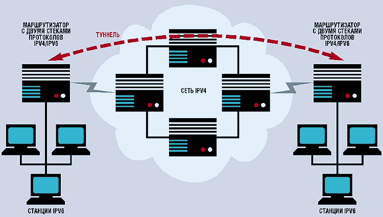 Стандарт IPv6 предусматривает прохождение пакетов через сети IPv4. Это означает, что приложения, использующие IPv6, могут работать в собственной сети и связываться с другими приложениями, также использующими IPv6, пересылая пакеты по Internet через имеющиеся средства маршрутизации IPv4.