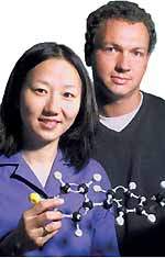 | Инженеры лаборатории Bell Labs Хендрик Шон и Женан Бао с моделью «транзистора будущего» |