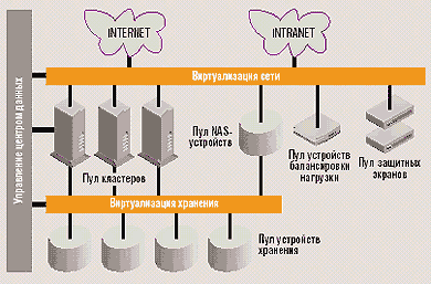 В результате объединения ресурсов появляется возможность представить весь центр в виде двух виртуальных пространств, отличающихся объединяющими их сетевыми технологиями, — в первом случае в виде обычной локальной сети, во втором — сети хранения данных. Можно сказать, что весь комплекс UDC сводится в единый континуум ресурсов, управляемый посредством Utility Data Center и Utility Controller Software. Вместе они предоставляют возможность планировать, проектировать и управлять ресурсами UDC. Перераспределение нагрузки, перегруппировка серверов производятся простейшими операторскими действиями. Возможность маневра вычислительными ресурсами UDC особенно важна при сезонных флуктуациях (классический пример — рождественские распродажи) или чрезвычайных изменениях нагрузки.