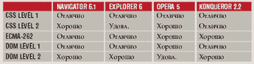 | По соответствию требованиям стандартов Web-браузеры заметно отличаются друг от друга. При этом последние версии (их список приводится в таблице) обладают более высокой совместимостью с существующими стандартами. |