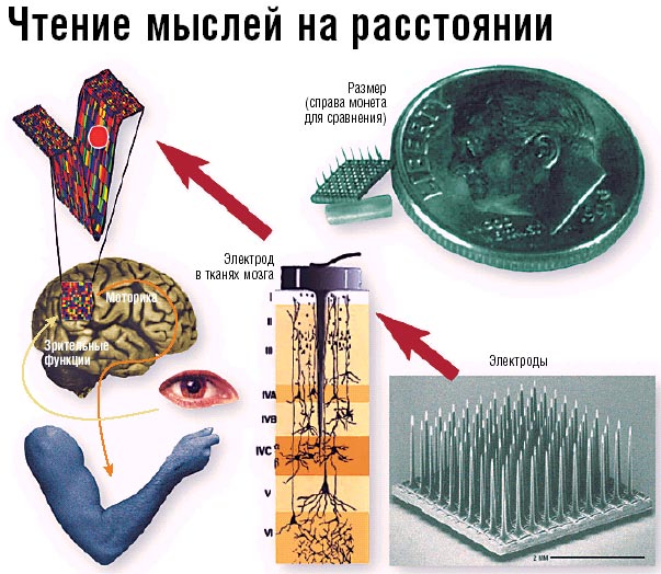 Исследователи в компаниях Caltech и Bionic Technologies изучают способы передачи сформировавшейся в мозгу системы импульсов, скажем, к механическому движению, в сигналы, которые могли бы управлять движениями робота. В данном примере микроскопические электроды имплантируются в теменную кору. Именно в этом участке мозга формируются импульсы к действию. Эти сигналы передаются в компьютер, который интерпретирует электромагнитные импульсы мозга для управления каким-либо устройством, например протезом