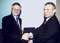 | Управляющий директор SAP СНГ Алексей Шлыков вручает Александру Слесаренко сертификат о присвоении «Юникон/МС» звания mySAP Local Alliance Partner |