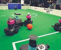 | Команды из Лиги роботов небольшого размера состоят из пяти колесных роботов. Они полностью автономны и не имеют связи в реальном времени со своими создателями |