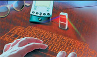 Инженеры израильской компании VKB предлагают оригинальное решение проблемы ввода текста на мобильных телефонах и PDA — виртуальную клавиатуру. В VKB разработано устройство, проецирующее изображение почти полноразмерной клавиатуры на плоскую поверхность. Распознавание набираемых символов по движению пальцев выполняется при помощи датчиков инфракрасного излучения. Розничная цена виртуальной клавиатуры будет находиться в пределах 100-150 евро.