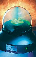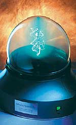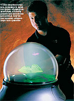 В углу тускло освещенного компьютерного зала компании Actuality Systems стоит прозрачный шар диаметром около 50 см. Это объемный дисплей для трехмерных изображений с самым высоким в мире разрешением. Заглянув в этот магический шар, я увидел нечто, напоминающее узкую перекрученную ленту зеленого цвета. В двух местах, там, где возникли «карманы» в структуре ленты, находилась напоминающая шар масса белого цвета с несколькими отростками, прекрасно подходящими по форме к этим «карманам». Я обошел шар вокруг и взглянул сверху, пытаясь рассмотреть эту необычную конструкцию под другим углом.