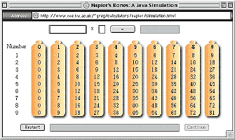В «Рабдологии...» Непер описал способ перемножения чисел посредством особых брусков-палочек с нанесенными на них цифрами, они внешне похожи на кости домино, но с большим числом полей на каждом из них. Идея автоматизации с помощью заранее размеченных палочек явно восходит к одному из древнейших способов умножения, который назвался gelosia. Сегодня никто не задумывается о внутренней сложности этого арифметического действия, даже словосочетание «способ умножения» звучит как-то странно, ведь единственный известный большинству алгоритм «в столбик» проходят в третьем классе. А в те далекие времена умножение было наукой, которой посвящали целые трактаты. Наиболее известен труд Луки Пачоли Summa de arithmetica, где среди прочих описан и этот способ gelosia, изобретенный в Индии и в XIV веке пришедший в Европу при посредничестве персов и арабов. Тем, кто заинтересуется методами умножения, рекомендую статью Multiplication Methods (www.ex.ac.uk/cimt/res2/trolfg.pdf), где прекрасно описаны различные древние приемы.