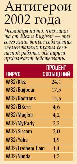 По данным компании, одним из самых докучливых для них стал Bugbear — «червь», распространявшийся по электронной почте и по сетям. За ним с небольшим отрывом следует Klez — «троянский конь», который вызывал рассылку электронных сообщений со случайным образом именованными файлами приложений и полями «тема».