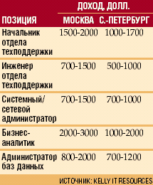 Для консультантов по технической поддержке ERP-систем общими требованиями являются опыт участия в крупных проектах, профессиональное владение продуктами компании, знание финансового учета как российского, так и международного, желательно наличие сертификатов. Консультанты с навыками внедрения продуктов SAP и MBS (Navision) зарабатывают от 1,5 до 2 тыс. долл., у консультантов по Oracle Applications, Scala и Platinum средний уровень оплаты от 1,2 тыс., специалисты со знанием «1С», «Галактики» и банковских программных продуктов оцениваются в 500-700 долл.