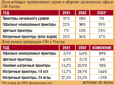 Московское представительство Oki Europe 28 мая представило итоги 2002 финансового года, завершившегося 31 марта 2003 года. Основные его показатели — план по обороту выполнен на 99%, по количеству устройств — на 113%, прибыль до налогообложения составила 124% от плановой (последний показатель, как заметил глава представительства Илья Звонов, рассчитывается в европейской штаб-квартире, поскольку представительство продаж не ведет).