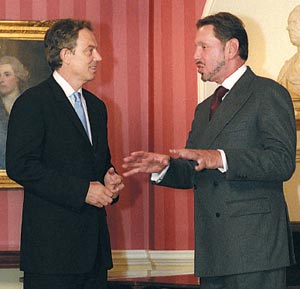 | Ларри Эллисон и премьер-министр Великобритании Тони Блэр обсуждают инициативу Oracle по организации обучения через Internet. В Британии корпорация вложила в этот проект более 4 млн. фунтов стерлингов |