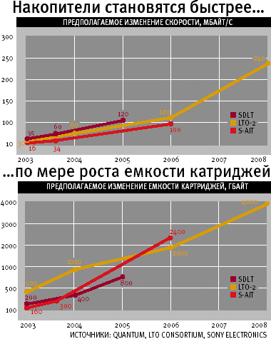 Как бы то ни было, пусть SDLT и LTO-2 идут «ноздря в ноздрю» в том, что касается емкости и производительности, формат S-AIT оставил их позади, когда в декабре прошлого года разработавшая его компания Sony Electronics представила на суд ИТ-общественности накопитель емкостью 500 Гбайт с пропускной способностью 30 Мбайт/с. Видимо, S-AIT сохранит за собой лидерство на протяжении некоторого времени.