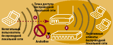 1. Нелегальный пользователь, находящийся вне здания, пытается установить связь с точкой доступа корпоративной беспроводной локальной сети