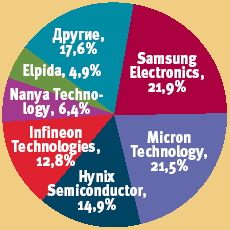 Мировой рынок микросхем DRAM в 2002 году Источники: данные IDC, Gartner, собственные оценки компаний |