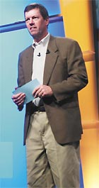 Глядя на нынешнего Макнили, невольно оцениваешь бег времени. И хотя годы берут свое, видимо, именно сейчас, как никогда прежде, во главе компании должен стоять менеджер с большим опытом. Груз проблем, который ложится на руководителя компании в 2003 году, намного тяжелее, чем в те золотые времена, когда процветать можно было только за счет азарта и изобретательности. Компьютинг проходит переходный период, характеризуемый множеством признаков, от новой системной философии до смены представлений о технологиях. Далеко не случайно было то, что одним из основных тезисов выступления доклада Макнили, которым он открывал конференцию, стала констатация отличия нынешней модели компьютерного бизнеса от модели, доминировавшей на протяжении предшествующих десятилетий. Раньше практически все компании поставляли отдельные «комплектующие» для информационных систем, представляя возможность потребителю самому собирать эти системы, а теперь следует отказаться от этой практики. На первый взгляд это утверждение может показаться банальностью, почти каждый из числа крупных вендоров указывает на нечто подобное в той или иной форме. Поэтому было чрезвычайно интересно узнать, что думает по этому поводу руководитель Sun Microsystems.