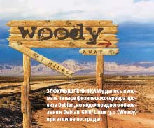 | Злоумышленникам удалось взломать четыре физических сервера проекта Debian, но код очередного обновления Debian GNU/Linux 3.0 (Woody) при этом не пострадал |