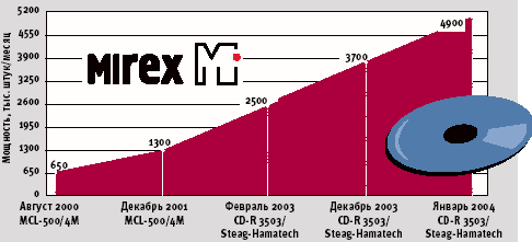 | Производственная мощность компании Mirex на данный момент составляет 5 млн. дисков в месяц. Необходимость увеличения производства возникла в связи с ростом рынка оптических носителей информации в России, повысившейся популярностью торговой марки Mirex на отечественном рынке, а также в связи с увеличением числа экспортных контрактов. План развития компании Mirex на 2004 год включает установку линий по производству записываемых DVD. В дальнейшем планируется ежегодное увеличение объемов производства