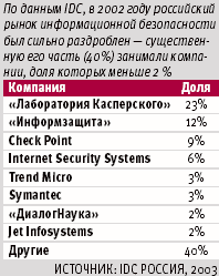 По данным IDC, в России приблизительно 48% компаний используют антивирусное программное обеспечение. Вторыми по популярности (около 29%) являются межсетевые экраны и средства построения виртуальных частных сетей. Примерно одинаковое количество финансовых средств тратится на решения для обнаружения атак (10%) и продукты для идентификации, авторизации и администрирования (11%). Другие технологии защиты информации на нашем рынке практически не представлены. В Европе же наибольшее внимание уделяется как раз средствам идентификации, авторизации и администрирования. Тем не менее, по утверждению Емельянова, в каждом классе защитных продуктов имеется хотя бы одна российская разработка.