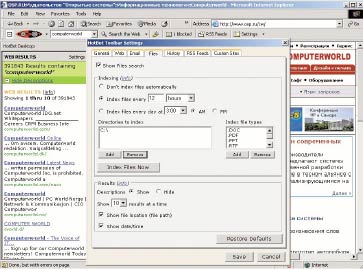 | Помимо поиска в Internet, HotBot Desktop поддерживает индексацию и поиск в сообщениях электронной почты в Outlook и Outlook Express, а также в документах Microsoft Office, файлах PDF и ряда текстовых форматов |