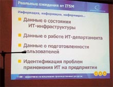 Впрочем, эти выводы — не повод для глубокого пессимизма, просто для большинства российских компаний опыт знакомства и практики ITSM еще слишком мал. Представленные в докладах и дискуссиях конференции результаты внедрения ITSM в торговой компании «Мир», фармацевтической компании Verafarm, управлении Центробанка РФ по Тверской области показывают, что выгоды от разумной организации управления ИТ-службой перевешивают большинство сомнений, стоят затраченных усилий и средств и стимулируют не останавливаться на достигнутом. Но, как отметил управляющий партнер компании IT Expert Михаил Потоцкий, ITIL, хотя и является своего рода библией для всех, кто заинтересован в эффективной работе ИТ-департаментов в интересах бизнеса, тем не менее не может рассматриваться как панацея для решения всех проблем, и проекты по внедрению ITSM должны учитывать реальные потребности каждой конкретной компании.